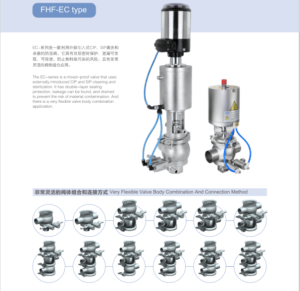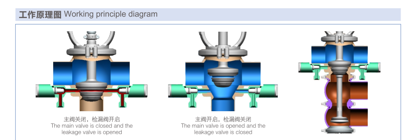 -The leakage chamber is closed when the valve is operating, the medium can flow through one pipeline to another. This valve can be clean in place. Many options of CIP and SIP combination are available to users.(Refer to cleaning sterilization function options)